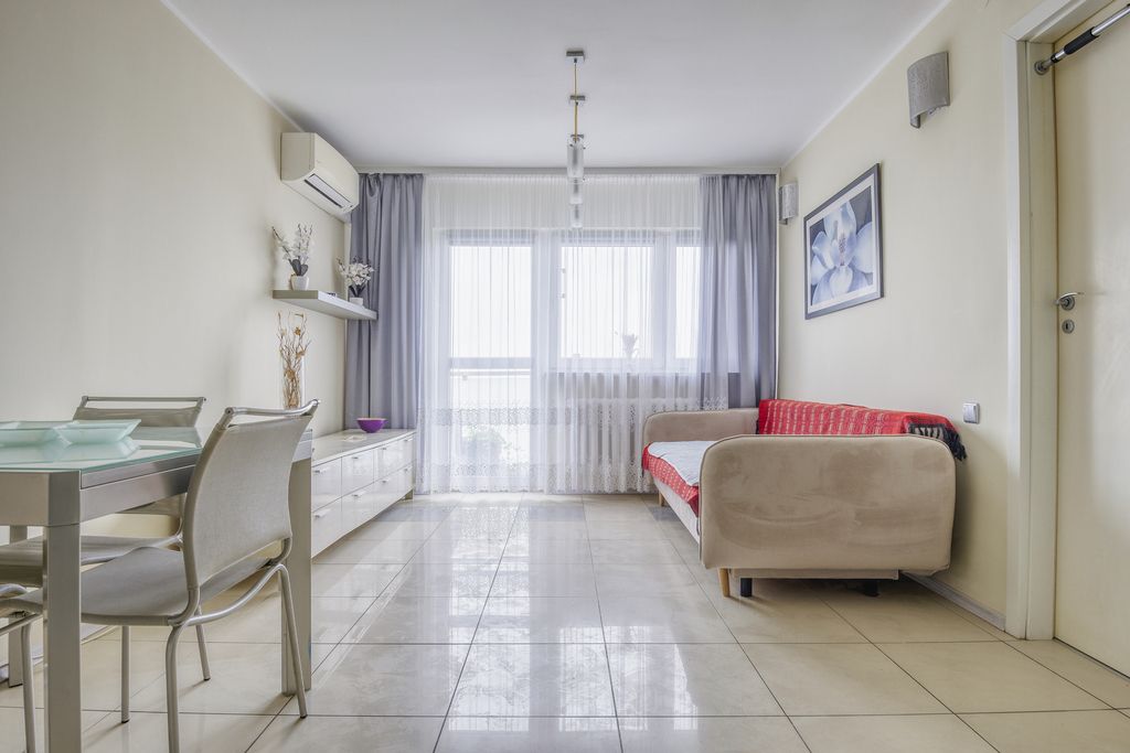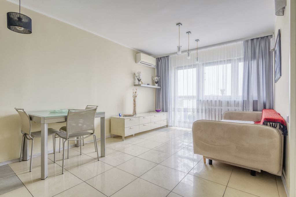 Apartament mieści się na 10 piętrze z pięknym widokiem na rozległą panoramę Warszawy.