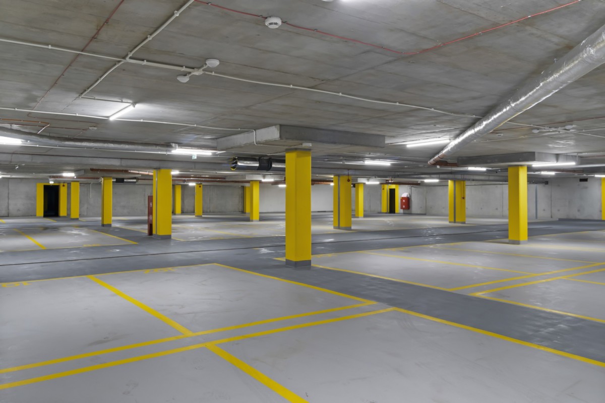 garaż podziemny z miejscami postojowymi i ładowarkami do aut elektrycznych,