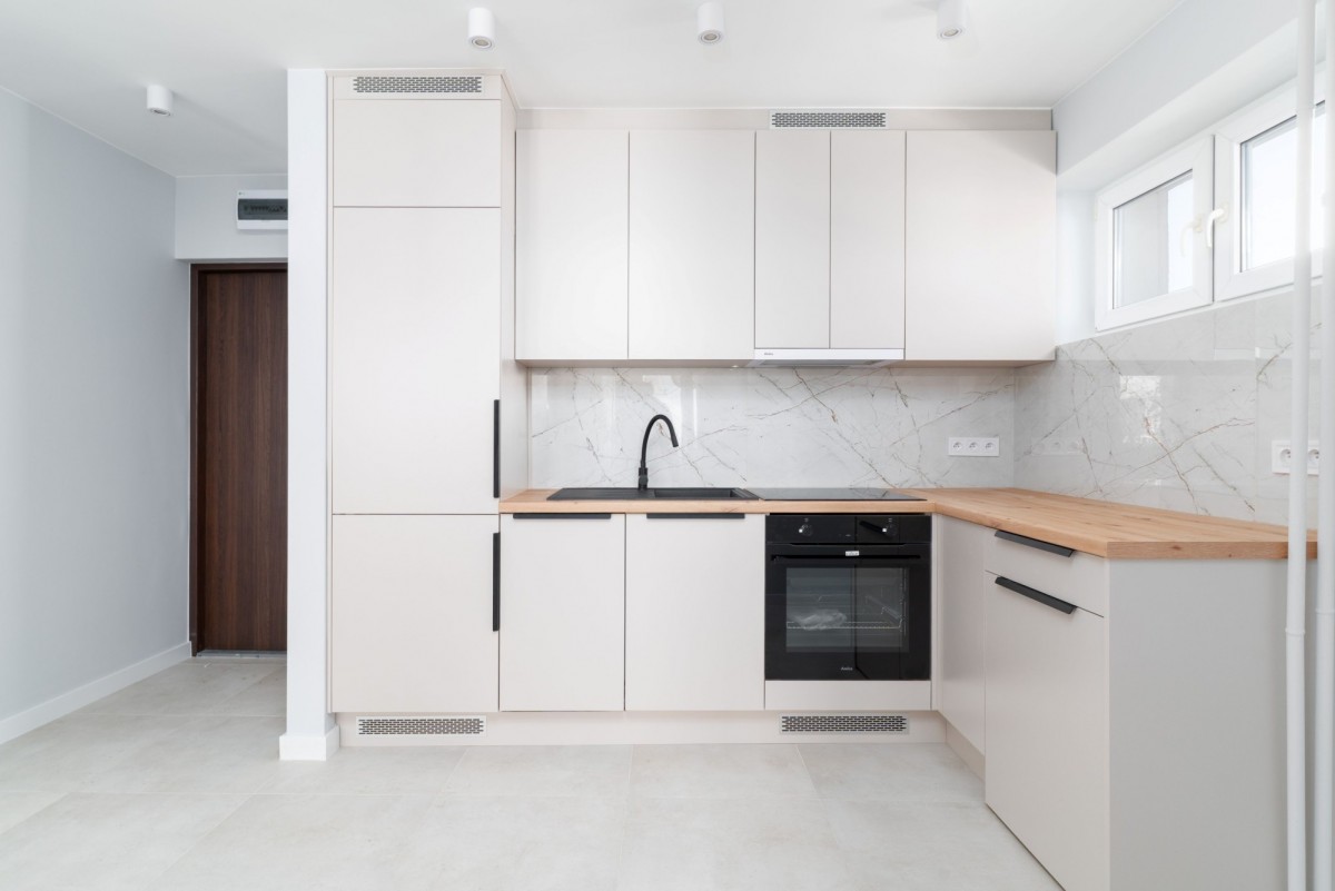 Elegancka kuchnia wyposażona jest w nowe sprzęty AGD - lodówka, płyta infukcyjna, piekarnik, zmywarka oraz pralka. Wszystkie sprzęty na gwarancji.
