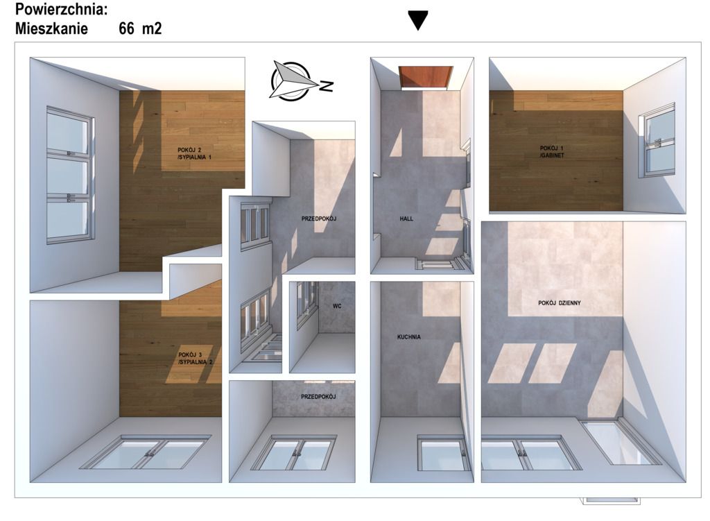 - Trójstronna ekspozycja (północ–wschód–południe), dzięki czemu mieszkanie jest przewiewne, zimą ciepłe, a latem chłodne.