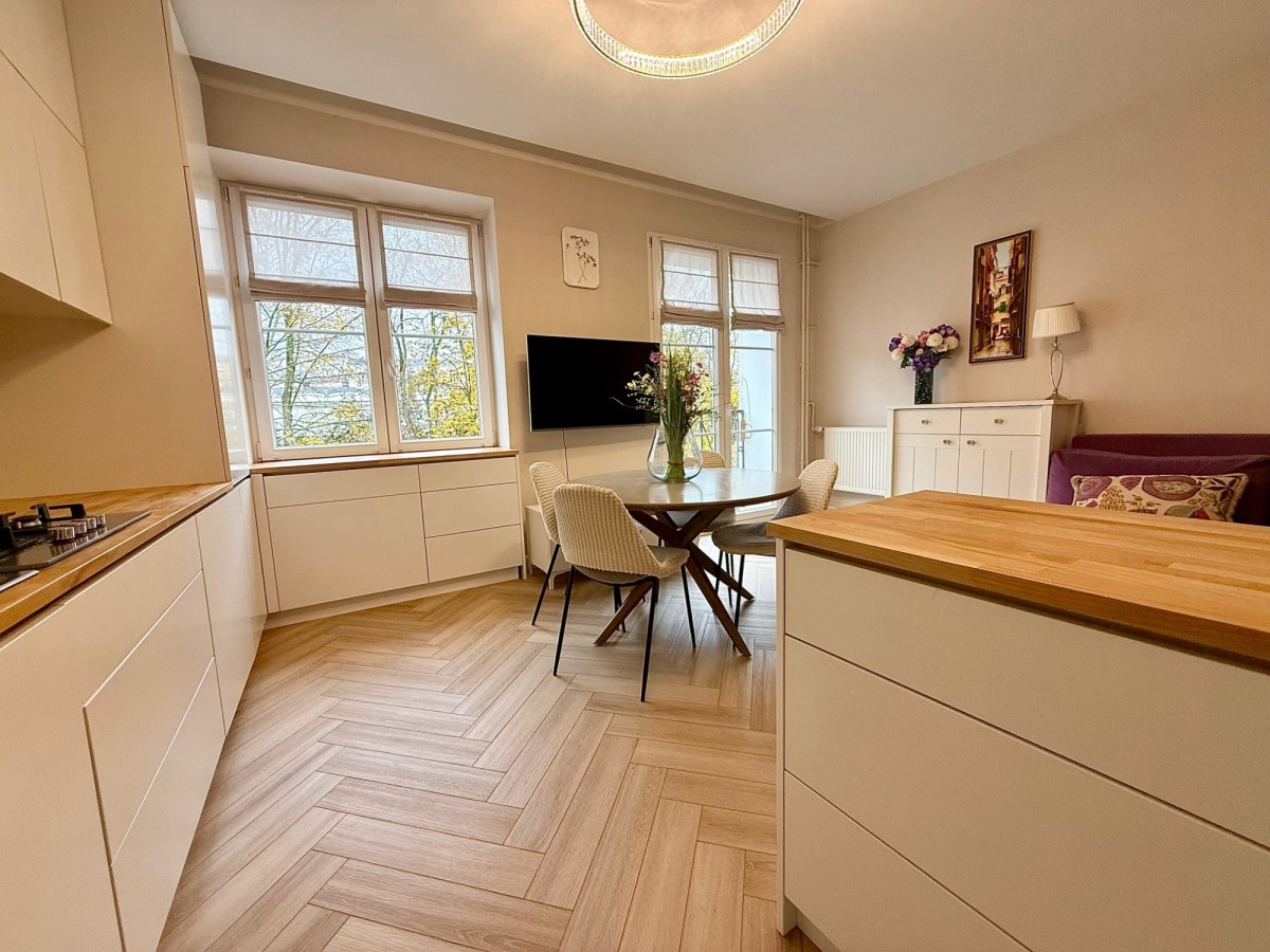Dwustronne, świeżo odświeżone mieszkanie na pierwszym piętrze o powierzchni 70m2 w trzypiętrowej kamienicy z 1953 roku, położone przy ul. Narbutta w sąsiedztwie kina Iluzjon.