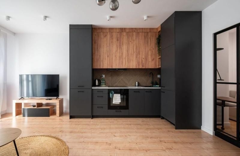 Salon: Elegancko urządzony z rozkładaną sofą i aneksem kuchennym.