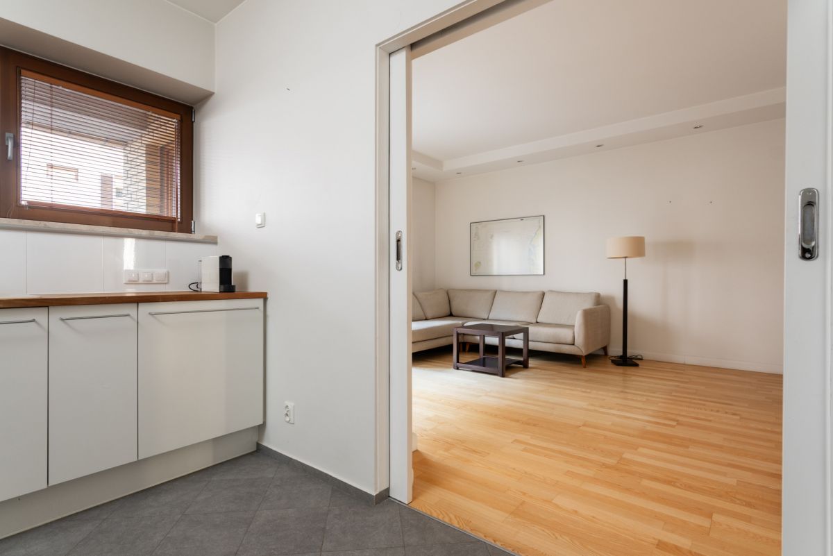 * oddzielna kuchnia oferuje sporą ilość drewnianego blatu roboczego oraz wszystkie niezbędne sprzęty AGD ukryte w estetycznej zabudowie. Funkcjonalna przestrzeń dla miłośników gotowania, którą można zupełnie odseparować od salonu.