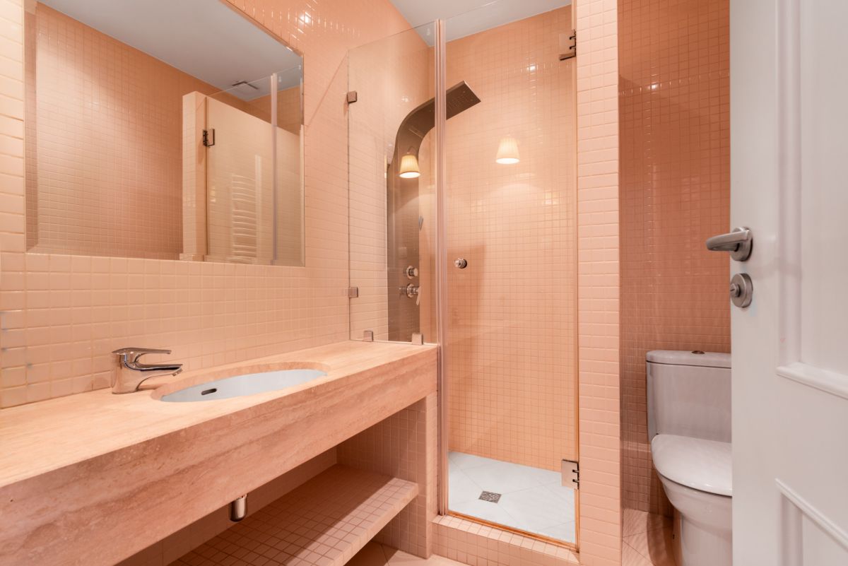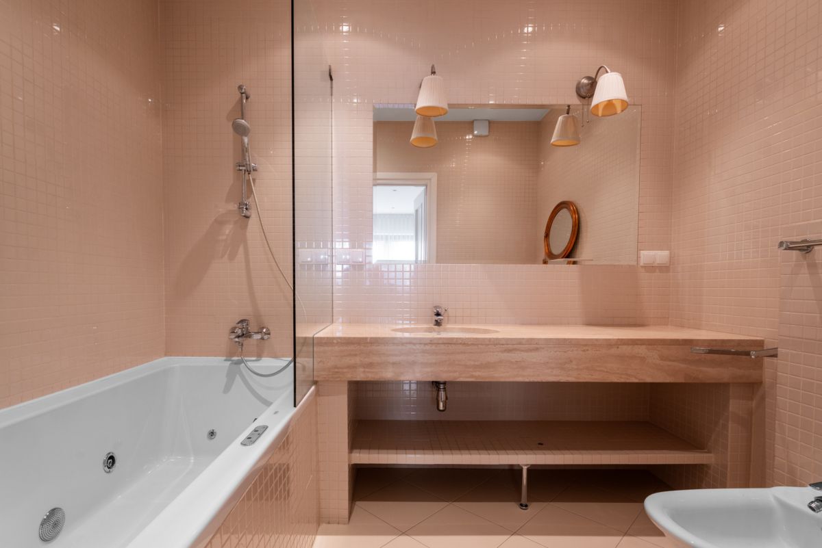 * dwie eleganckie łazienki wykończone kamiennymi blatami. Pierwsza łazienka z wanną, druga z kabiną prysznicową