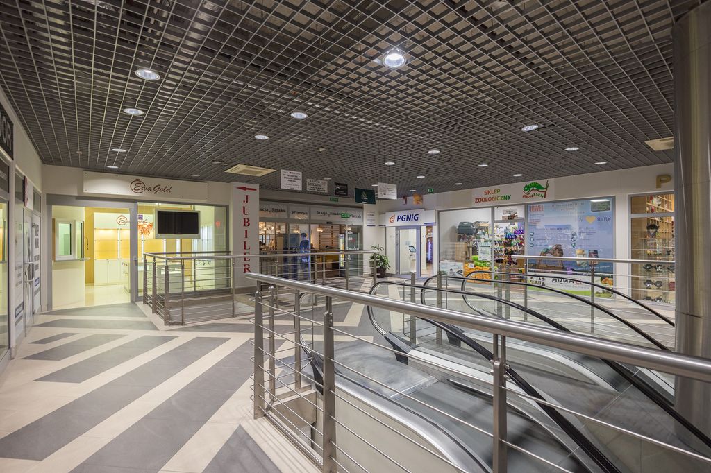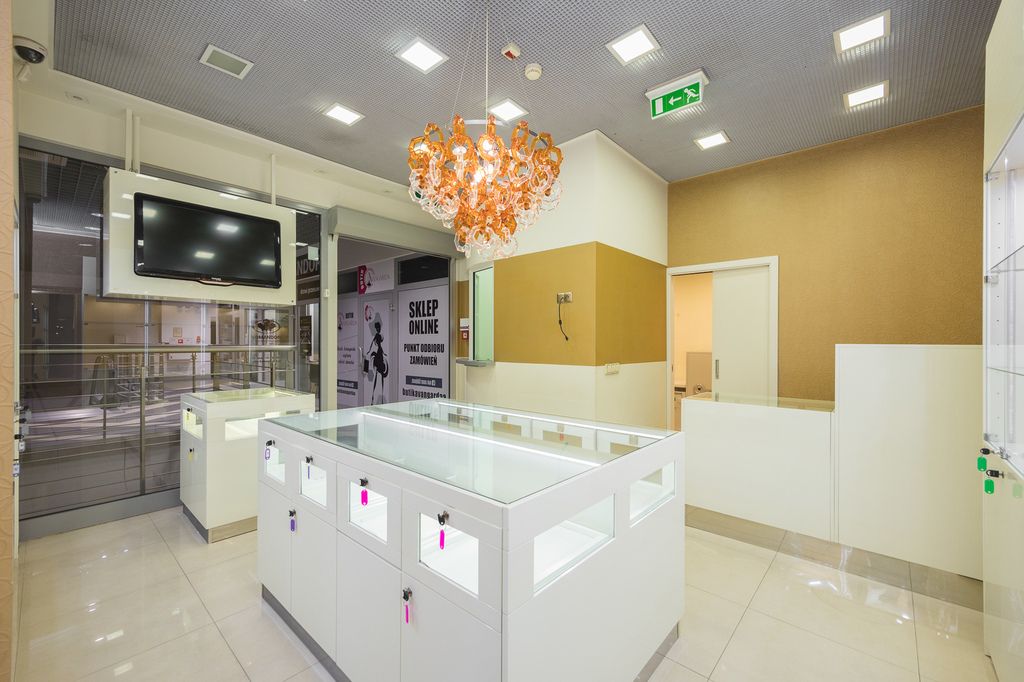 Lokal jest w pełni wyposażony wg. projektu renomowanej pracowni architektonicznej (możliwość przekazania kompleksowego projektu z inwentaryzacją kupującemu), meble, witryny z przeszkleniami na wymiar, wyspa w sali sprzedaży podświetlane LED. Ekrany LCD w sali sprzedaży z przeznaczeniem pełnienia funkcji dodatkowych nośników reklamowych (1 widoczny z zewnątrz, 1 widoczny od wewnątrz). Na ścianach tapeta, na podłogach wysokiej jakości gres, designerskie oświetlenie. Nowoczesna instalacja elektryczna z systemem zabezpieczeń, alarmem, zabezpieczeniami przeciwpożarowymi z czujnikami dymu i zraszaczami, monitoringiem. Przeszklona witryna z przygotowanym miejscem na powierzchnię reklamową (np. logo firmy). W pełni wyposażone zaplecze socjalne z kuchnią oraz WC dla personelu. Oddzielne pomieszczenie z dodatkowymi zabezpieczeniami - kantor z pancernymi szybami i drzwiami spełniającymi rygorystyczne normy towarzystw ubezpieczeniowych. W lokalu do 2021 roku znajdował się salon jubilerski z ekskluzywną biżuterią. Lokal idealny do prowadzenia działalności gospodarczej handlowej lub usługowej. Położony w miejscu o dużym natężeniu ruchu bezpośrednio przy schodach ruchomych (każdy klient galerii wjeżdża na I piętro na wprost lokalu), obok dobrze prosperująca restauracja, biuro obsługi PGNiG, punkt handlowy Szafy i Zabudowy Komandor, ponadto w Galerii - Banki, Auchan, kawiarnia, cukiernia liczne punkty handlowe, usługowe, salony piękności, Fitness.