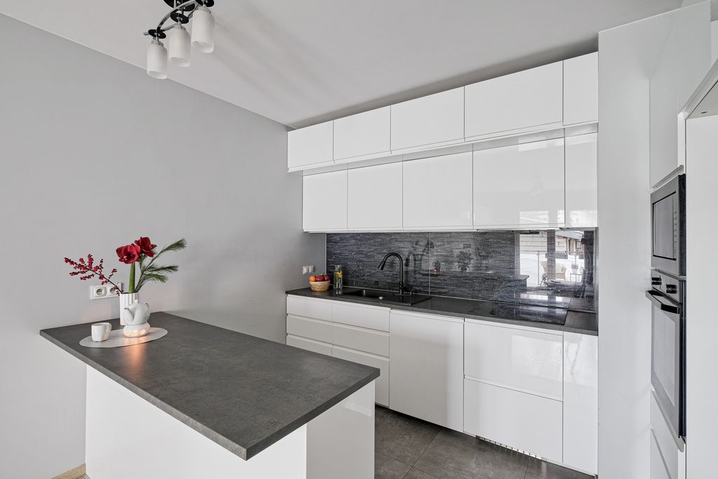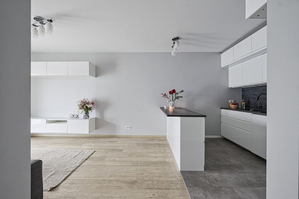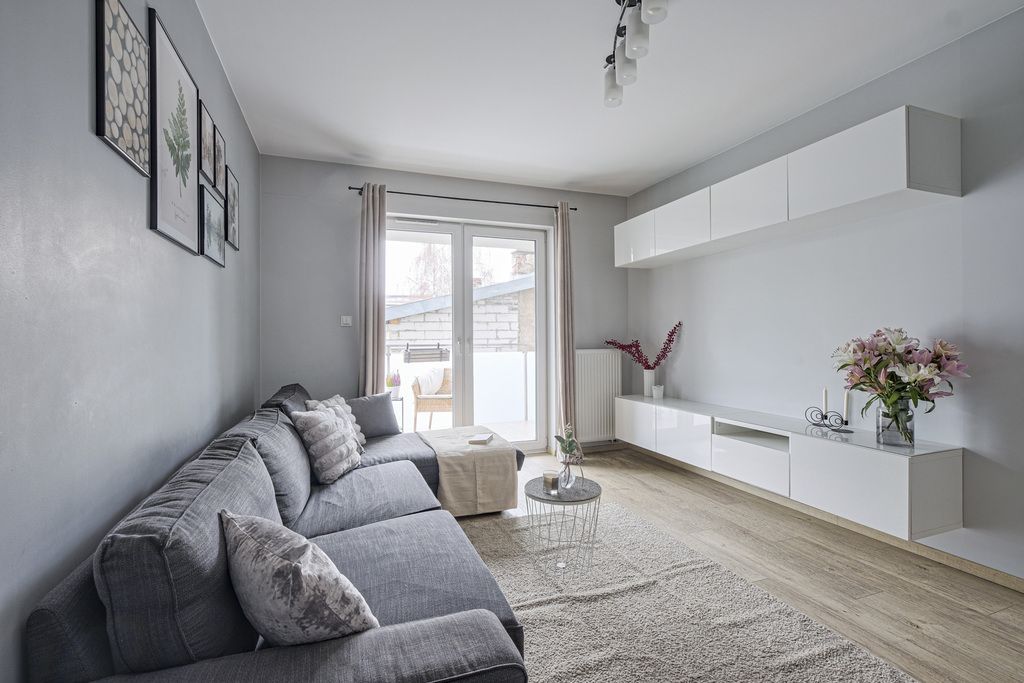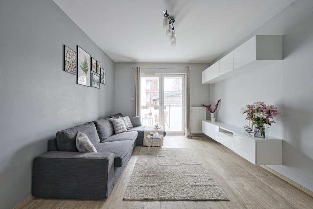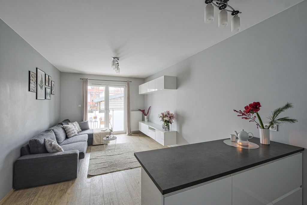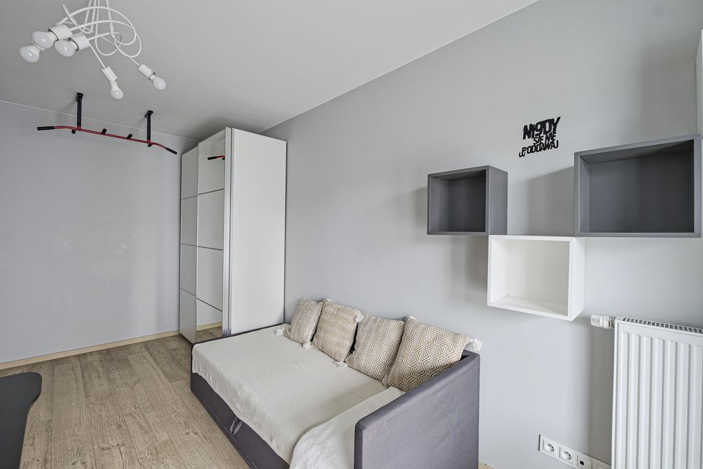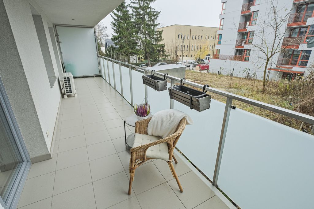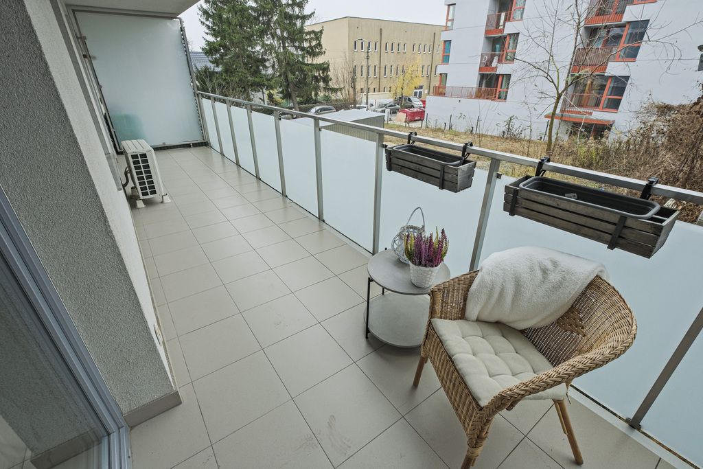 Ogromnym atutem jest balkon o powierzchni 16 m², rozciągający się wzdłuż całego mieszkania z wyjściem zarówno z salonu, jak i z mniejszego pokoju.