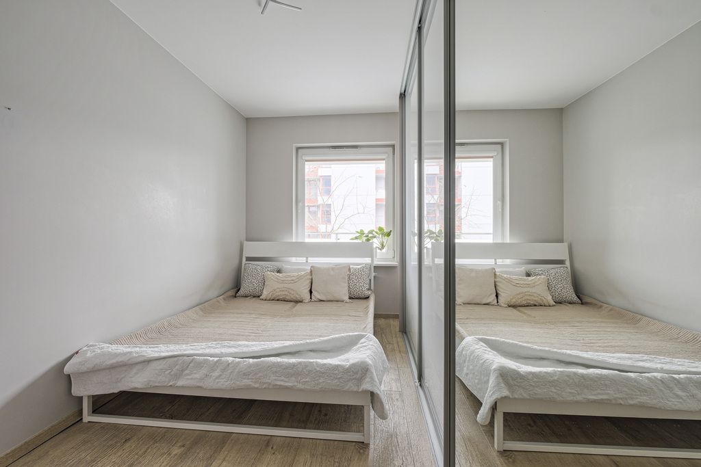 • jasna sypialnia z dużym łóżkiem i szafą w zabudowie,