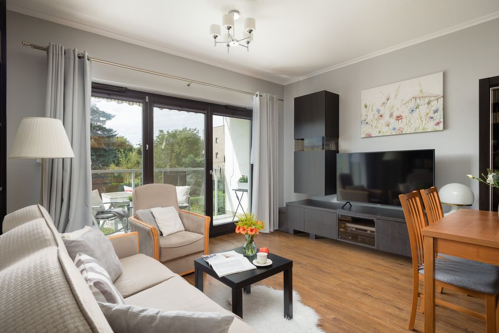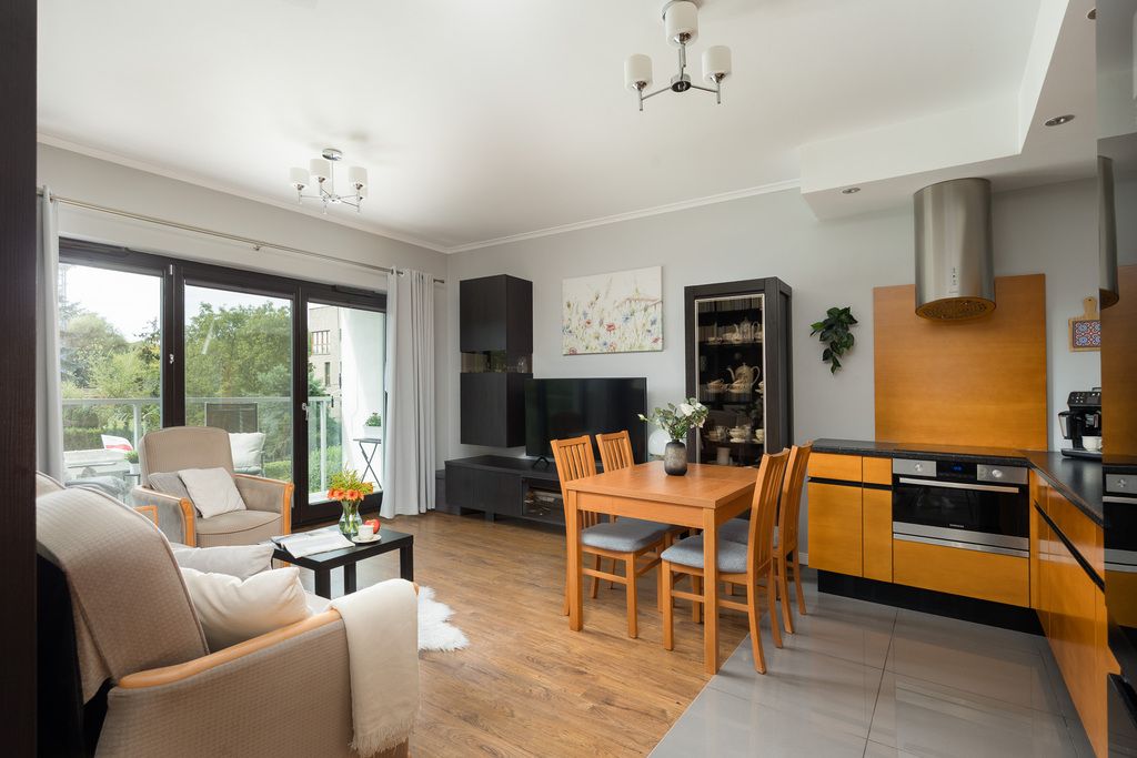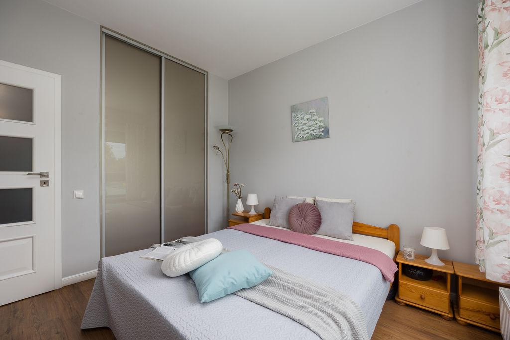 This neighborhood combines proximity to the Vistula River and green spaces with proximity to the city center. The apartment is located on the first floor of a cozy, four-story building with an elevator, built in 2012 by SGI Development. The development is very well-maintained and fully accessible for people with disabilities.