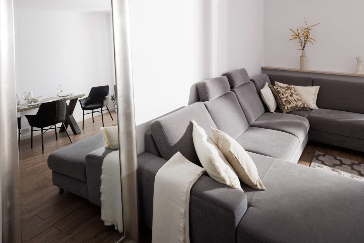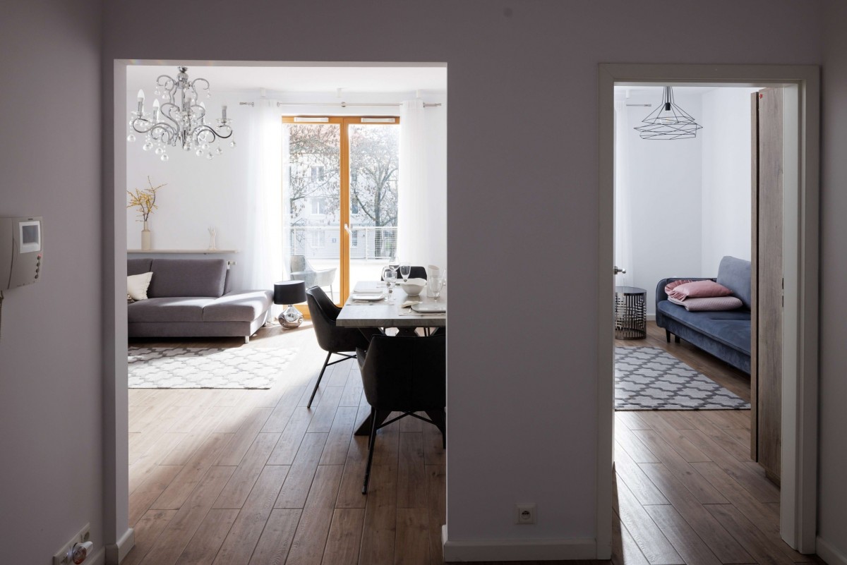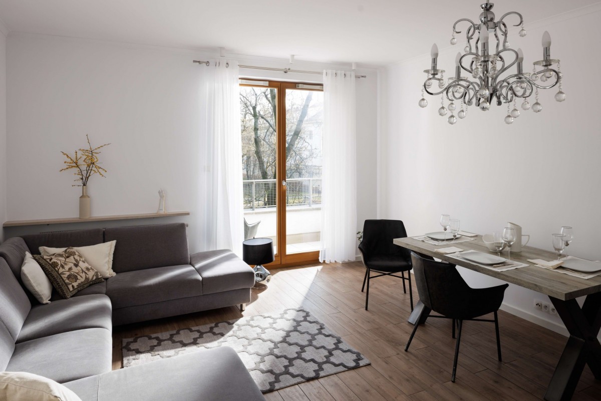 - jasnego salonu z balkonem z wygodną kanapą i strefą jadalnianą,