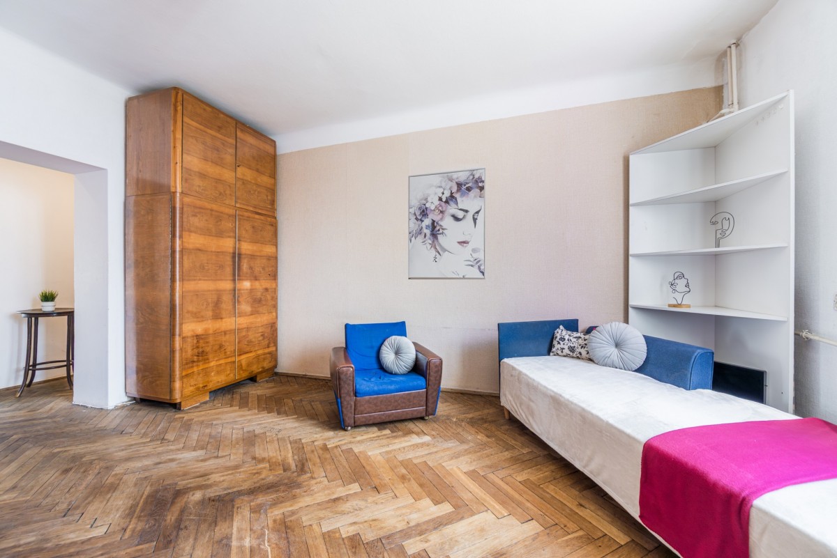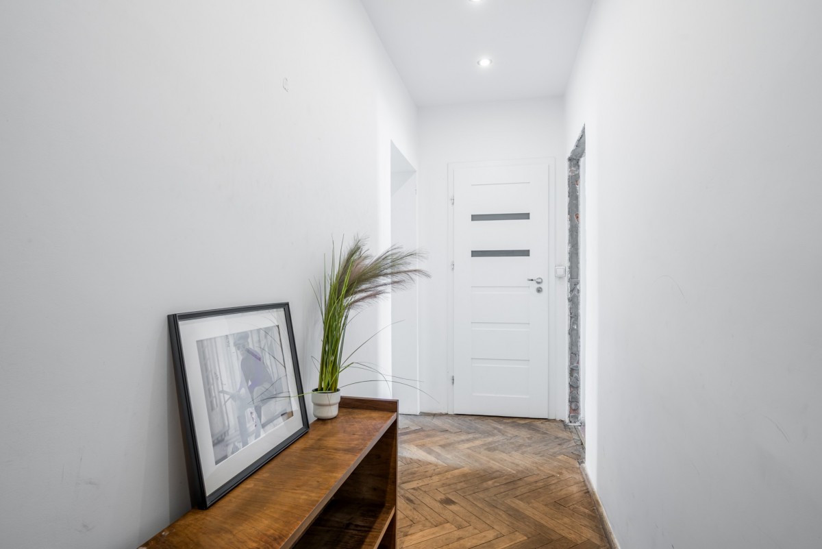 Na podłodze oryginalny parkiet do renowacji, przy suficie charakterystyczne zaokrąglenia, które wracają do łask.