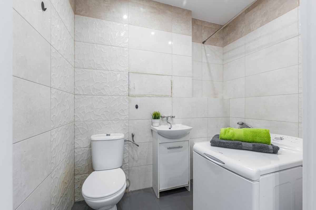 - łazienka, która mieści wannę, toaletę, umywalkę oraz miejsce na pralkę,