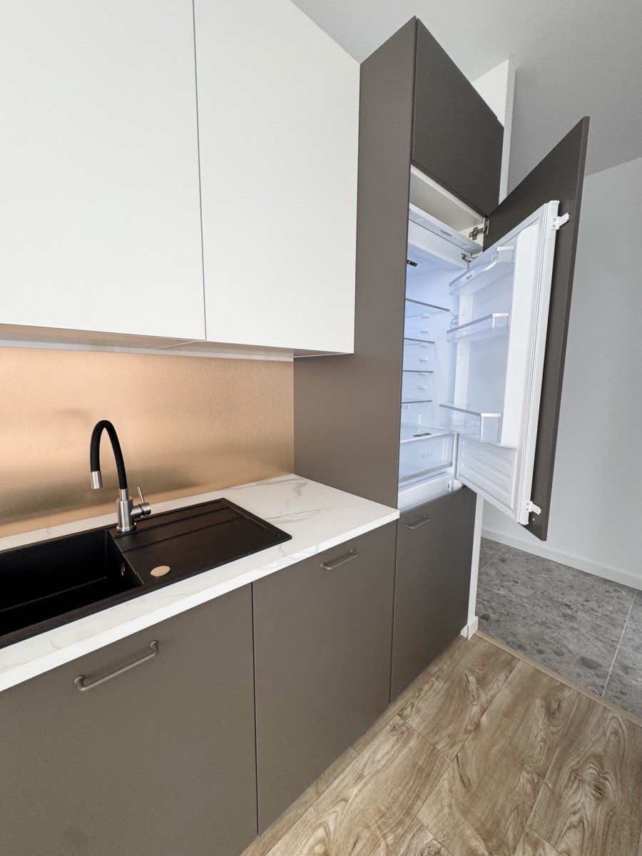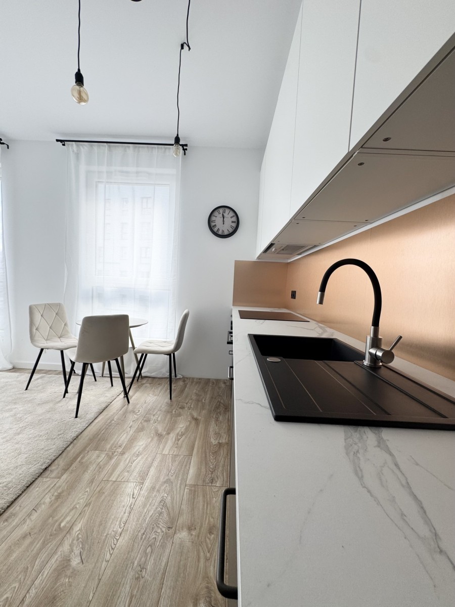 Komfortowa, duża kuchnia wyposażona w zmywarkę, lodówkę, piekarnik i płytę indukcyjną (Amica). Kuchnia połączona jest z salonem, w którym znajduje się stół z 3 krzesłami, wygodna kanapa, stoliki kawowe.