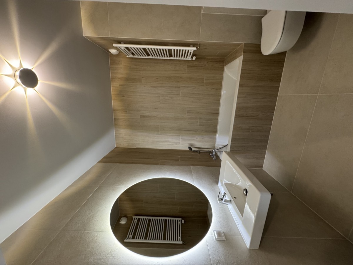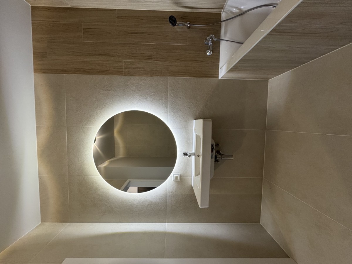 Łazienka wykończona gresem i ceramiką Villeroy&Boch, z wanną, dużym podświetlanym lustrem oraz pralką.